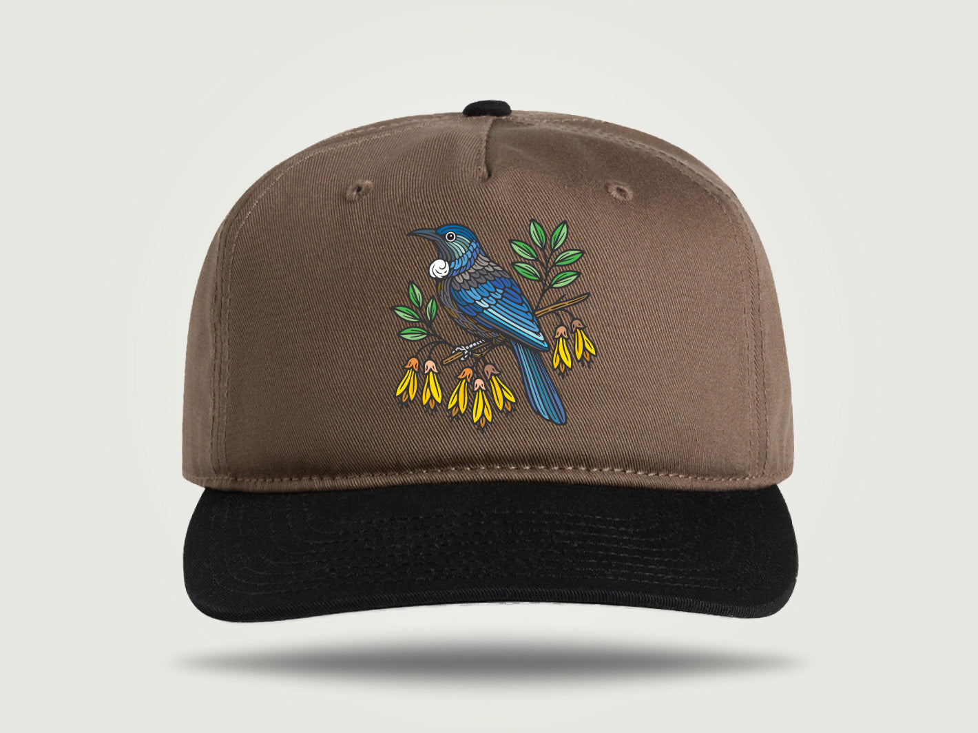 It’s single panel at front features our custom Native Kererū Wood Pigeon graphic in a durable digital print. The Tone Cap: A lightweight, mid-profile five-panel cap crafted from 100% cotton. Featuring a stylish contrast dome, flat peak, rear snapback closure, and tonal eyelets for ventilation.