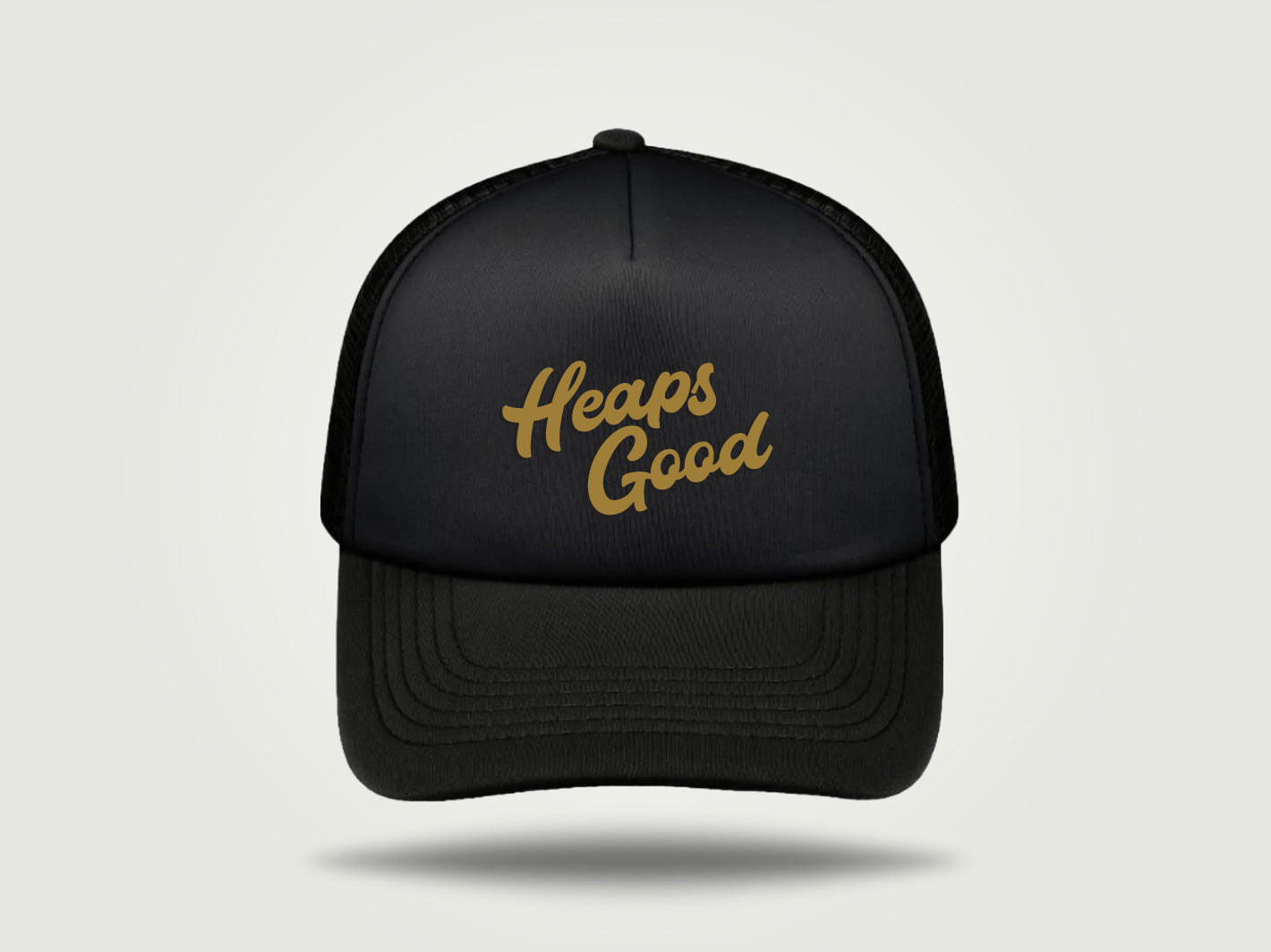 Our Foamie Trucker, as old school as old school gets. This vintage cap style is paired with our metallic Heaps Good Script. So let's get the mahi done so we can remember fondly our trips to Georgie Pie for an apple pie and large fries.