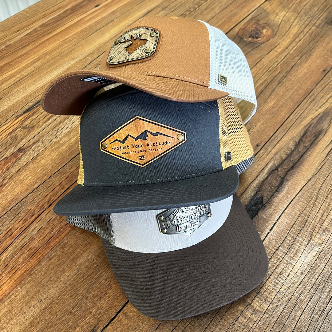 The etching of the various badges is done right here in New Zealand from three different laser etching companies who each specialise in different materials, Auckland for the etching directly onto the cap fabric direct, Christchurch for the laser etched steel and Dargaville for the laser etched wooden badges.