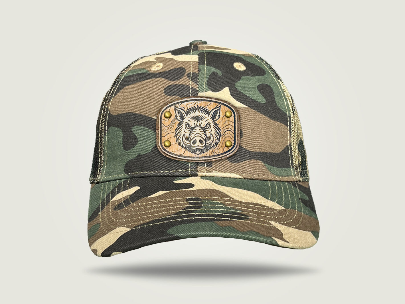 We've matched the Camo Trucker Cap with our custom laser etched wooden badge collection, backed with NZ tanned leather to deliver a classic craftsman look on a functional outdoor cap to celebrate the wilderness.